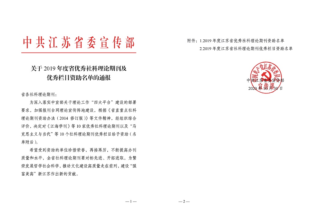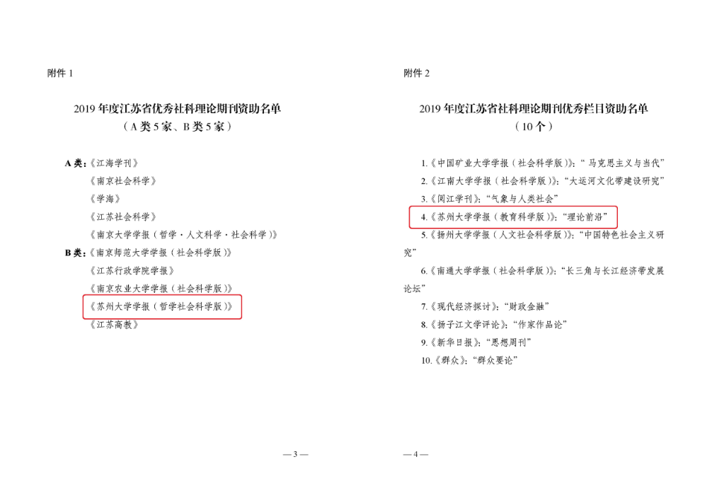 近日,根据江苏省委宣传部《关于2019年度省优秀社科理论期刊及优秀栏目资助名单的通报》,《苏州大学学报(哲学社会科学版)》获得优秀社科理论期刊资助,《苏州大学学报(教育科学版)》的“理论前沿”栏目获得社科理论期刊优秀栏目资助。