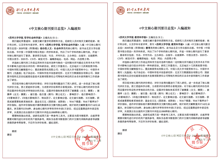 近日,据《中文核心期刊要目总览》2020年版编委会通知,《苏州大学学报(哲学社会科学版)》和《苏州大学学报(教育科学版)》同时入编《中文核心期刊要目总览》2020年版(即第9版)核心期刊。其中,哲社版为综合性人文、社会科学类核心期刊,教科版为教育类核心期刊。这也是学报教科版创刊以来首次入编该核心期刊。
