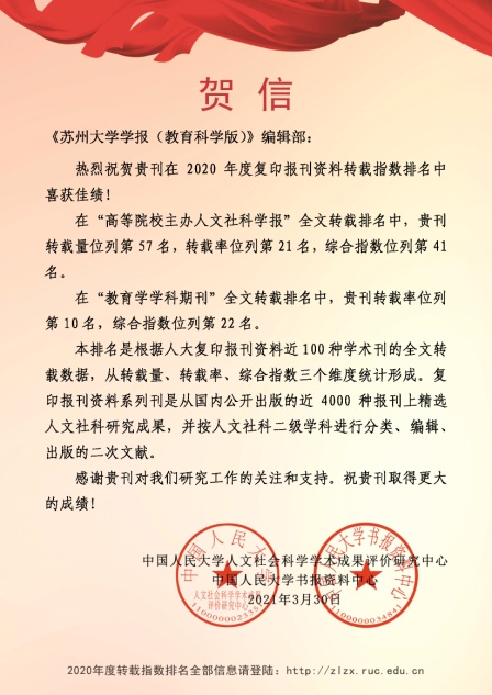 2021年3月30日,中国人民大学人文社科成果评价发布论坛暨学术评价与学科发展研讨会在北京召开。论坛发布了“复印报刊资料重要转载来源期刊(2020版)”和 “2020年度复印报刊资料转载指数排名”两项成果。我校学报哲社版、教科版、法学版三刊继2017年后再次同时入选复印报刊资料重要转载来源期刊,并在转载指数排名中成绩显著。