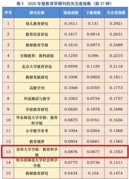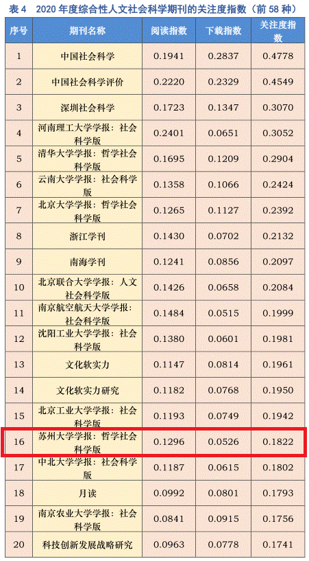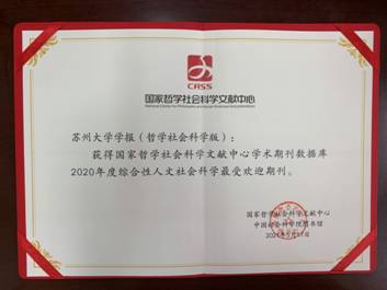 近日,国家哲学社会科学文献中心、中国社会科学院图书馆发布了《国家哲学社会科学文献中心学术期刊数据库用户关注度报告(2020年度)》。《苏州大学学报(哲学社会科学版)》名列综合性人文社会科学期刊关注度排行榜第16位、《苏州大学学报(教育科学版)》名列教育学学科期刊关注度排行榜第13位,两刊同时荣获最受欢迎期刊。