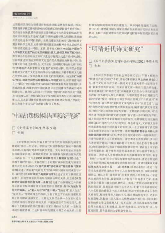 2021年第4期刊发的曹虹《清代骈文学上的自然论》、胡媚媚《清代耆老会与诗人并称群体的结社传统》、黄建林《癸未大水纪事本末与文学书写——以〈绘水集〉为中心》三篇论文,被《高等学校文科学术文摘》(2021年第5期)“专栏推介”栏目重点性整体推介。这不仅是对三篇文章选题和质量的认可,更是对“明清近代诗文研究”栏目长期高质量建设的肯定。三篇论文分别从文学理论、文学集会、文学事件等不同角度展开,体现了明清近代诗文研究的前沿视角和宽广路径。
