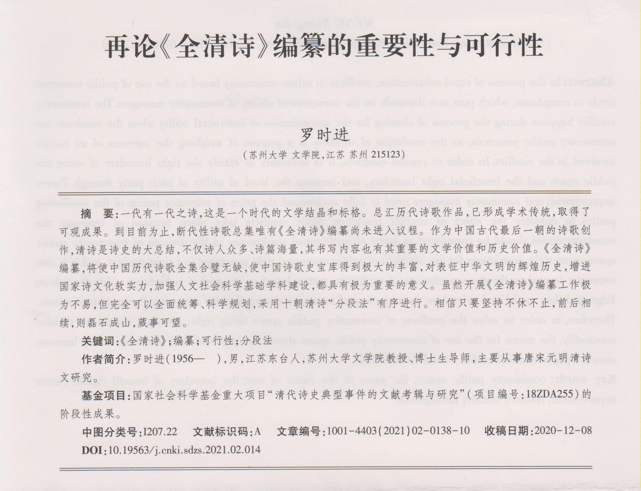 2021年第2期刊发的罗时进《再论<全清诗>编纂的重要性与可行性》一文,被《新华文摘》(2021年第13期)、《中国社会科学文摘》(2021年第8期)、《社会科学文摘》(2021年第6期)全文转载,同时《北京大学学报(全国高校文科学报概览)》(2021年第5期)头条推介。《全清诗》是迄今尚未进入议程的断代诗歌总集,罗时进指出其编纂“将使中国历代诗歌全集合璧无缺,使中国诗歌史宝库得到极大的丰富,对表征中华文明的辉煌历史,增进国家诗文化软实力,加强人文社会科学基础学科建设,都具有极为重要的意义”。罗时进在论文中从确定符合学术规范与编纂实际的收录范围、进一步积累清诗版本目录学研究成果、适时编纂《清代十朝诗人谱录》等方面对《全清诗》编纂进行了具体学术规划,阐述了编纂理路,提出了以十朝为序的“分段法”编纂方案,对推进这一“功在当下、利在千秋”的重大学术工程具有重要学术价值。