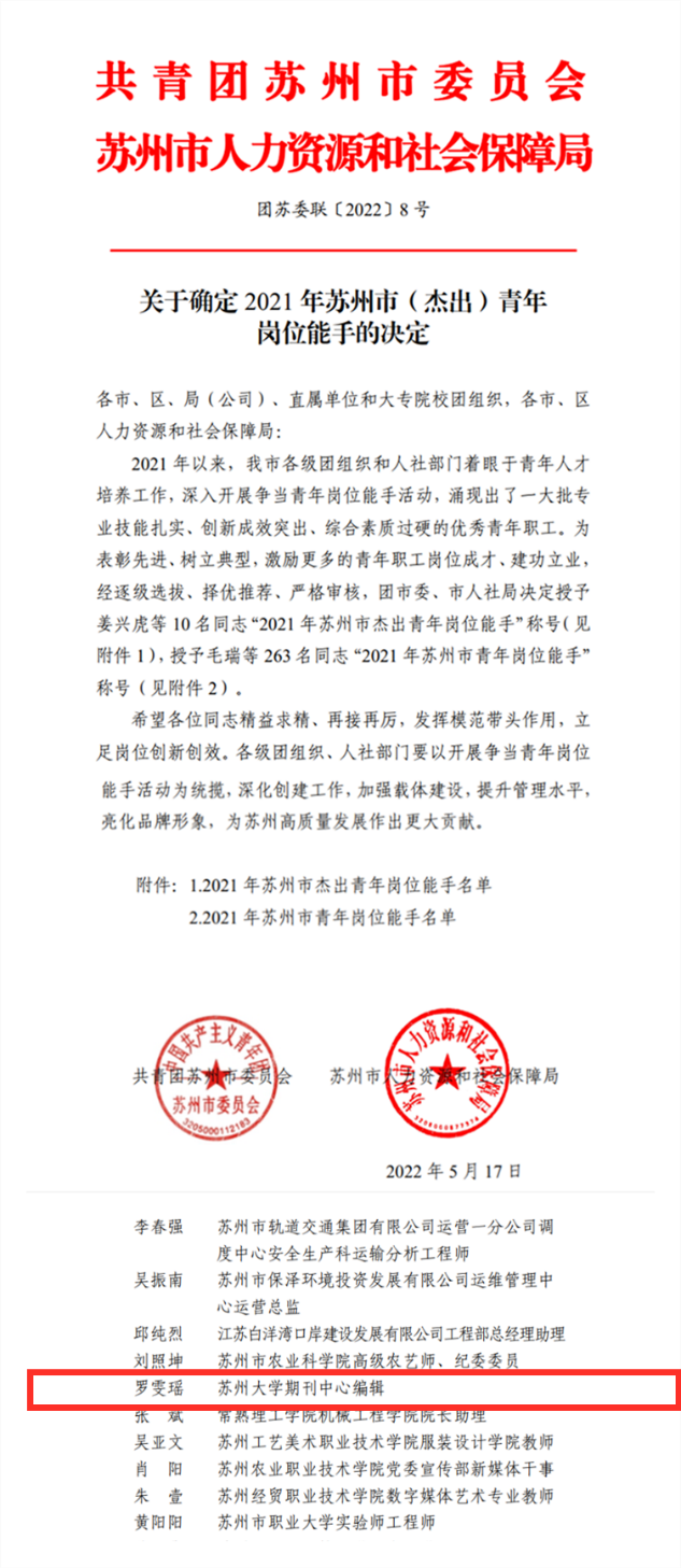 近日,共青团苏州市委员会、苏州市人力资源和社会保障局联合发文,表彰2021年苏州市(杰出)青年岗位能手。我校期刊中心编辑罗雯瑶荣获“苏州市青年岗位能手”称号,为本年度苏州大学唯一人选。