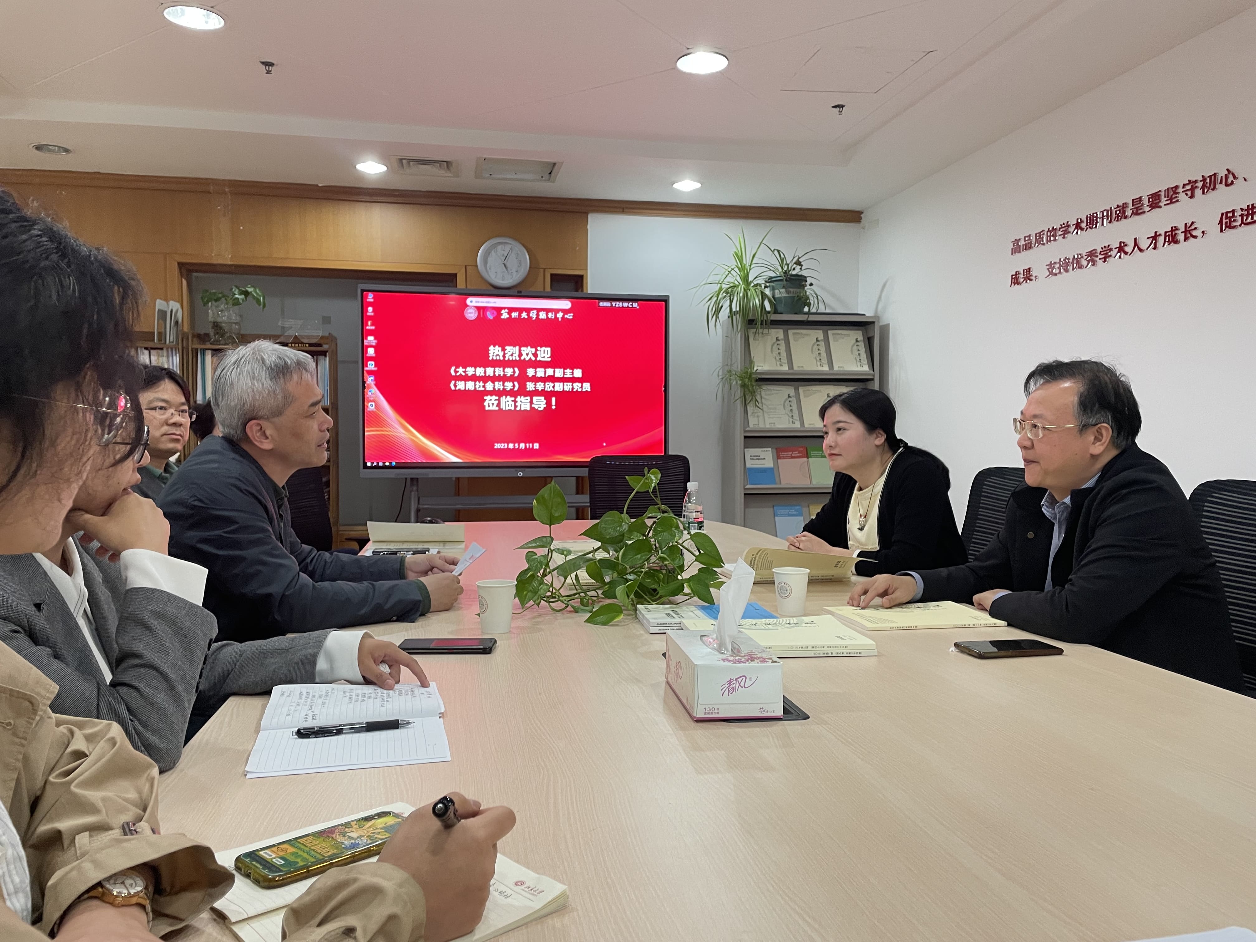 5月11日,《大学教育科学》李震声副主编和《湖南社会科学》张辛欣副研究员来到期刊中心进行访问交流,并与期刊中心人员进行了座谈。双方就学术期刊的办刊、编辑、校对、审核等流程的规划和技术问题等展开了深入交流学习。座谈会由期刊中心主任江波主持。