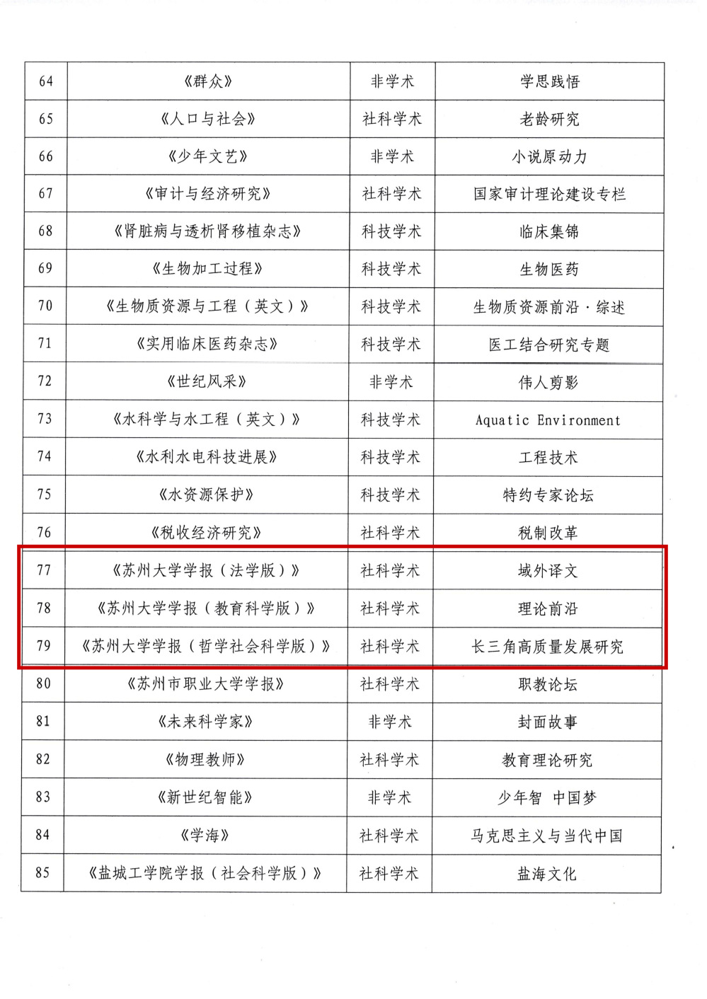 近日,2024年度江苏期刊明珠奖·优秀栏目推荐名单发布,经专家评委会初审、江苏省期刊协会会长办公会终审,确定推荐107个栏目为江苏期刊明珠奖·优秀栏目,《苏州大学学报(哲社版)》“长三角高质量发展研究”栏目、《苏州大学学报(教科版)》“理论前沿”、《苏州大学学报(法学版)》“域外译文”栏目成功入选。其中,《苏州大学学报(哲社版)》是继入选中宣部“首批哲学社会科学期刊重点专栏”以来,今年第二次斩获栏目建设类殊荣。
