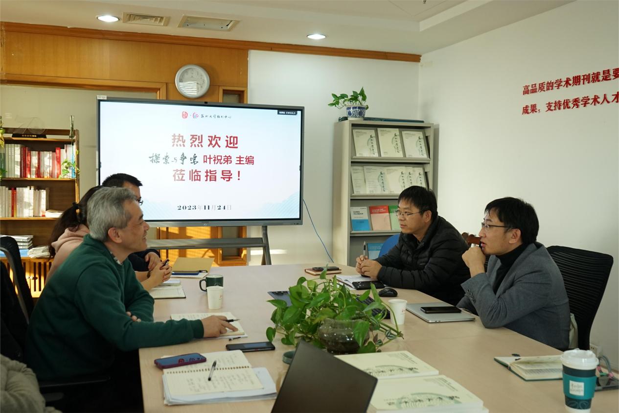 11月24日,上海社科联《探索与争鸣》主编叶祝弟编审来到苏州大学期刊中心进行座谈交流,苏州大学期刊中心全体编辑共13位参加交流活动,双方围绕学术期刊办刊过程中“有学术的思想如何可能”这一主题展开了深入探讨。