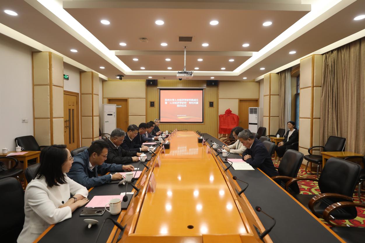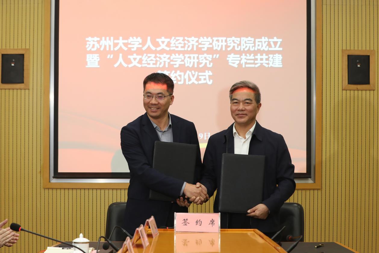 为了深入学习和阐释习近平总书记这一理论创新话语,凸显中国式现代化苏州样本的探索意义,10月9日下午,苏州大学人文经济学研究院成立暨“人文经济学研究”专栏共建签约仪式在我校天赐庄校区红楼会议中心举行,苏州市委常委、宣传部部长金洁,苏州大学党委副书记邓敏等领导出席会议,会上苏州市委宣传部副部长、苏州市社科联主席刘伯高与苏州大学党委常委、副校长李孝峰共同为“人文经济学研究”专栏共建签约。